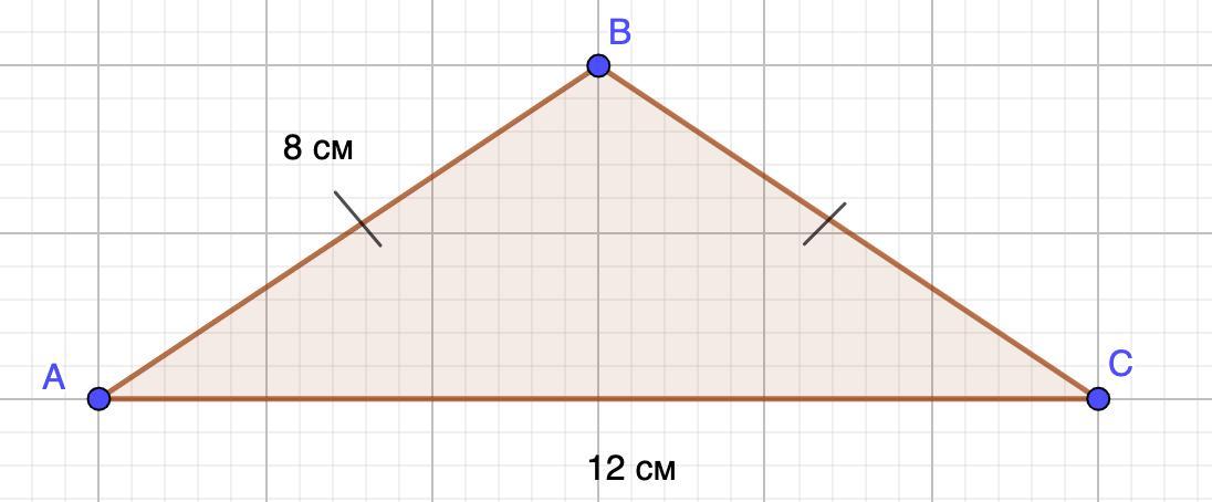 ⇒ Р (ΔАВС) = 12+8+8=28 (см)