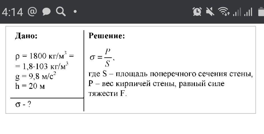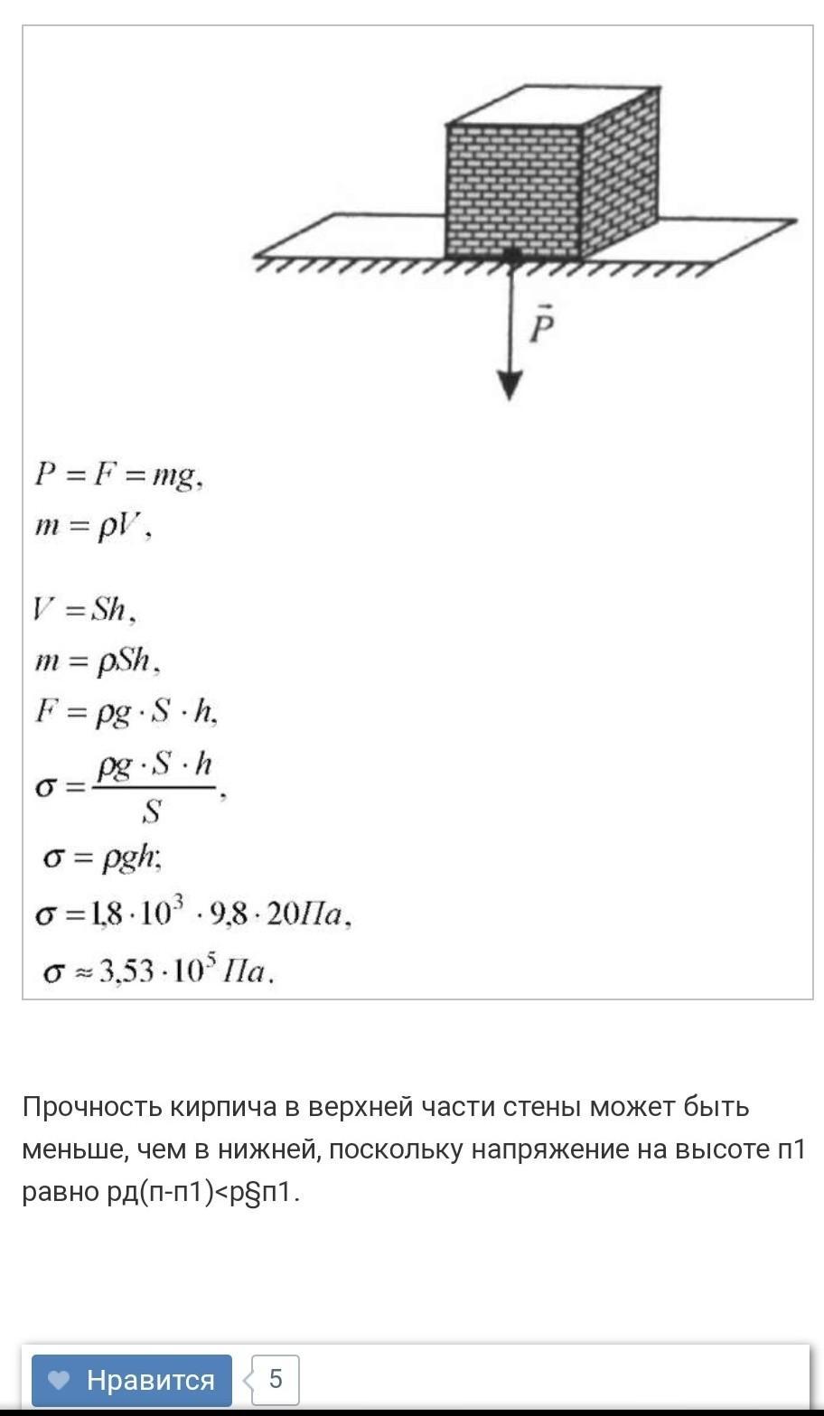 Определите напряжение в основании кирпичной стены высотой 20 м. Одинакова ли прочность кирпича внизу и вверху стены?