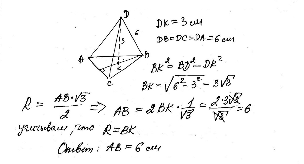 Точка Д не лежит в плоскости равностороннего треугольника, удалена от него на 3 см и находится на расстоянии 6 см от его вершин. Найти сторону треугольника.