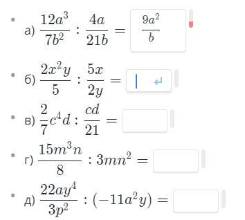б) 4xy^2/25 в) 2с^3/3 г) 5m^2n/8n д)-2y^3/3ap^2