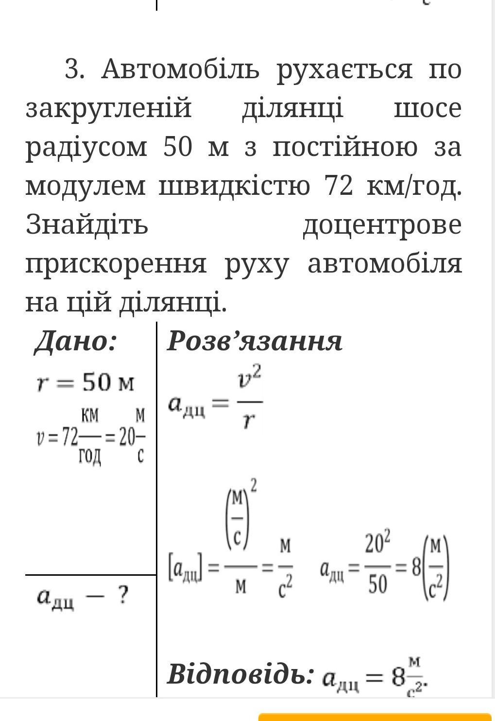 3. Автомобіль рухається по закругленій ділянці шосе радіусом 50 м з постійною за модулем швидкістю 72 км/год. Знайдіть доцентрове прискорення руху автомобіля на цій ділянці.