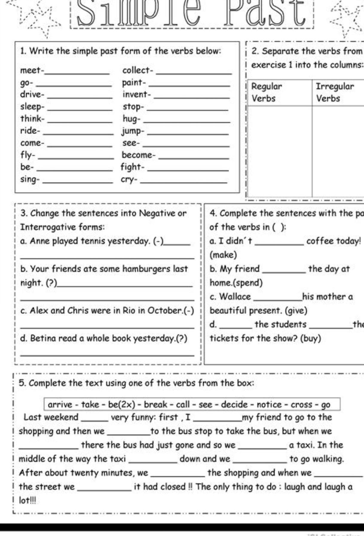 1. Met, went, drove, slept, thought, rode, came, flawn, been, sung, collected, painted, invented, stopped, hugged, jumped, saw, became, fought, cried