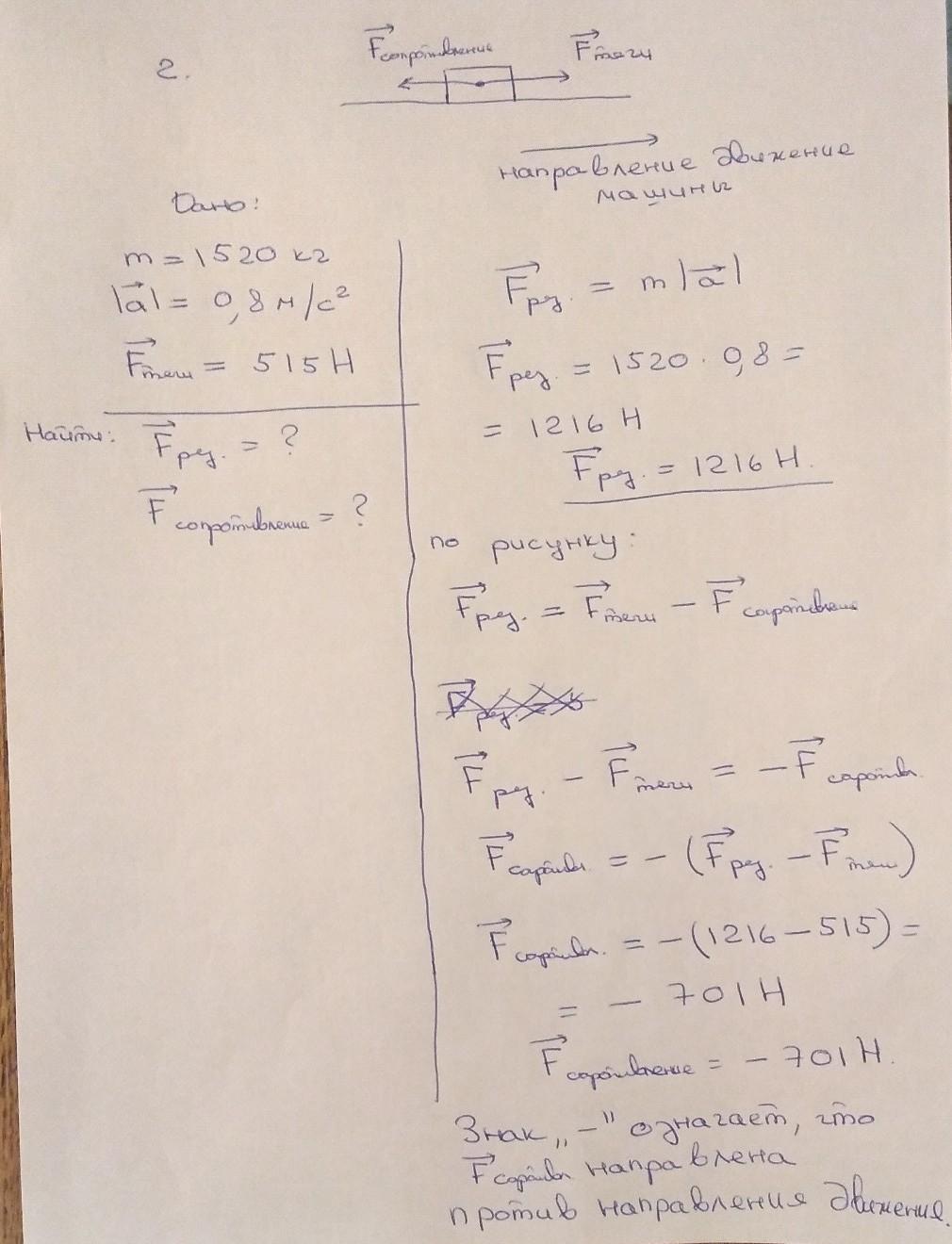 2)Легковая автомашина массой 1520 кг притормаживает на прямолинейном отрезке дороги. Модуль ускорения равен 0,8 мс2, а действующая на машину сила тяги равна 515 Н.