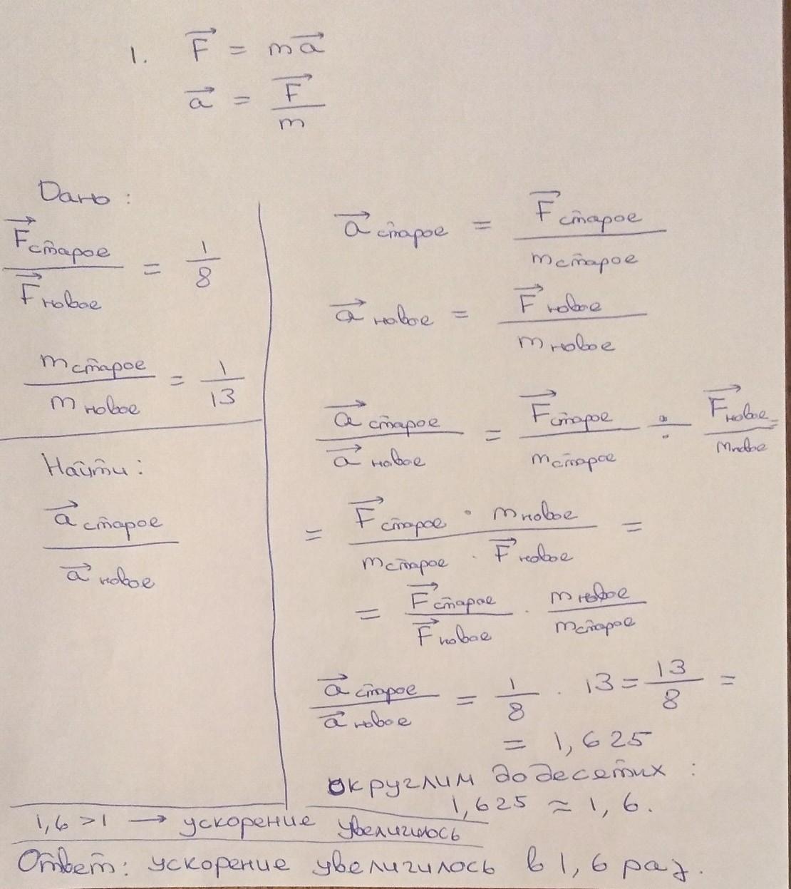 1)Как и во сколько раз изменится ускорение движения тела а , если действующая на тело сила F уменьшится в 8 раз(-а), а масса m тела уменьшится в 13 раз(-а)?