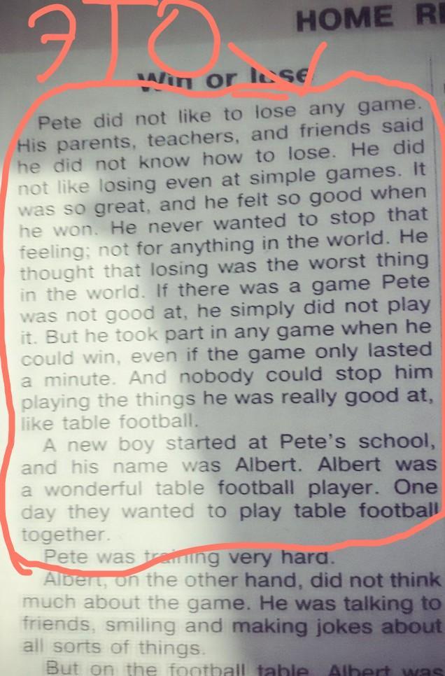 Его родители, учителя и друзья говорили, что он не умеет проигрывать. Он не любил проигрывать даже в простых играх. Это было так здорово, и он чувствовал себя так хорошо, когда выиграл. Он никогда не хотел избавиться от этого чувства, ни за что на свете. Он считал, что проигрыш-это самое страшное, что есть на свете. Если и была какая-то игра, в которую Пит не умел играть, то он в нее просто не играл . Но он принимал участие в любой игре, когда мог выиграть, даже если игра длилась всего минуту. И никто не мог помешать ему играть в то, в чем он был действительно хорош, например, в настольный футбол. В школе Пита появился новый мальчик, и звали его Альберт. Альберт был прекрасным игроком в настольный футбол. Однажды они захотели вместе поиграть в настольный футбол вместе.