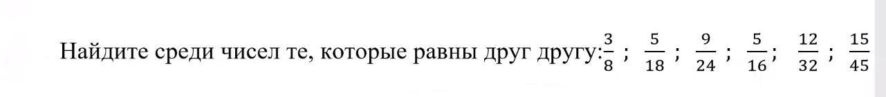 найдите среди чисел те, которые равны друг другу -- 3/8 ; 5/18 ; 9/24 ; 5/16 : 12/32 ; 15/45