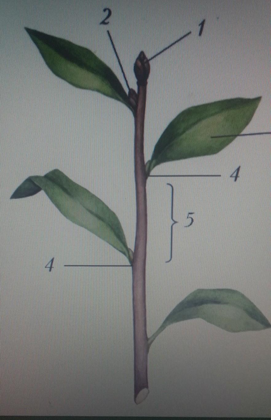 Цифра 3 на рисунке это верхушечный лист, цифра 1 это узел, цифра 2 это междоузлие, цифра 5 это боковая почка
