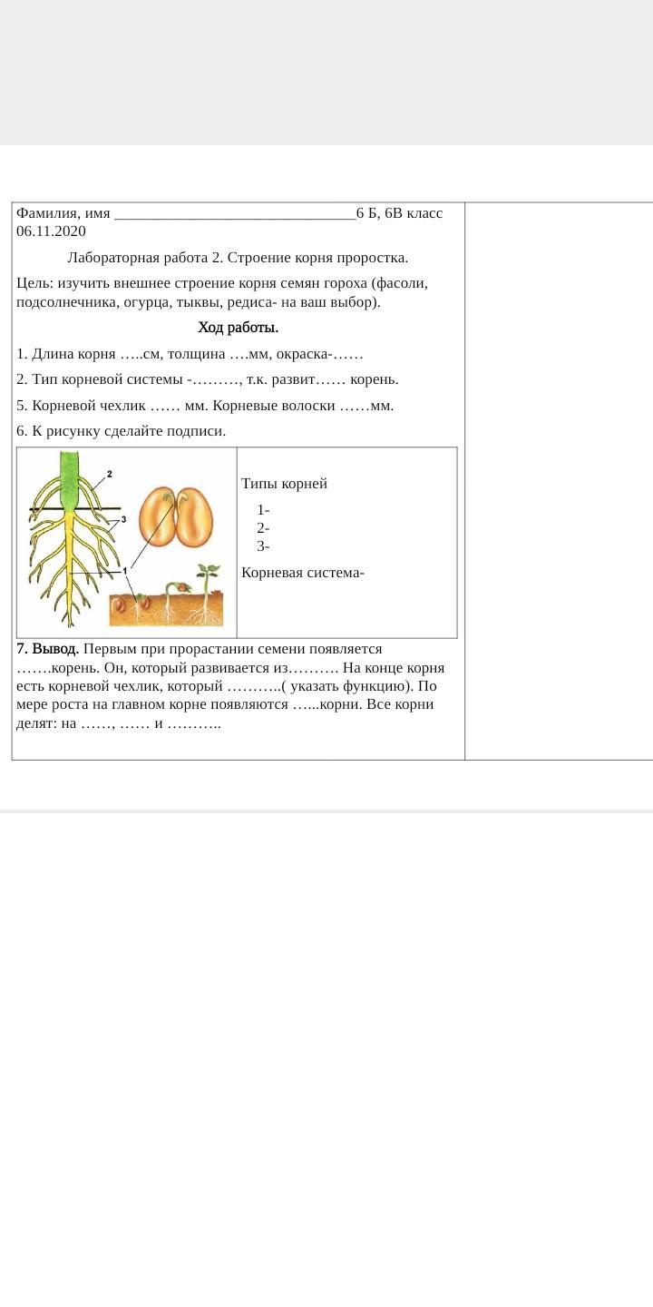 Ответ: ход работы. 1)длина корня 1, 3 см., толщина 1, 1мм, окрас-молочно-белый. 2)тип системы-стержневая, т.к развит главный корень. 3)корневой чехлик 1,5 мм., корневые волоски 1 мм. ТИПЫ КОРНЕЙ: 1-главный, 2-придаточные, 3-боковые. Корневая система - стержневая. ВЫВОД (только пропущенные слова): Главный. Зародышевого корешка семени. Защищает зону деления. Боковые корни. Главный, боковые, придаточные.