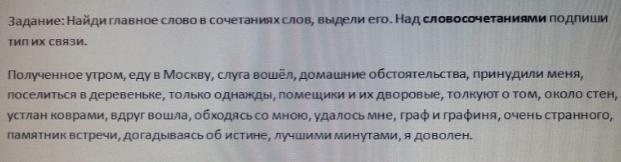 Полученное (когда?) утром - управление; еду (куда?) в Москву - управление; слуга вошёл - подлежащее и сказуемое не являются словосочетанием; домашние обстоятельства (какие?) - согласование; принудили (кого?) меня - управление; поселиться (где?) в деревеньке - управление; только (когда?) однажды - примыкание; помещики и их дворовые - сочетание однородных членов предложения не является словосочетанием; толкуют (о чём?) о том - управление; около (чего?) стен - примыкание; устлан (чем?) коврами - управление; вдруг вошла (как?) - примыкание; обходясь (с кем?) со мною - управление; удалось (кому?) мне - управление; граф и графиня - сочетание однородных членов предложения не является словосочетанием; очень (какого?) странного - примыкание; памятник (чего?) встречи - управление; догадываясь (о чём?) об истине - управление; лучшими минутами (какими?) - согласование.