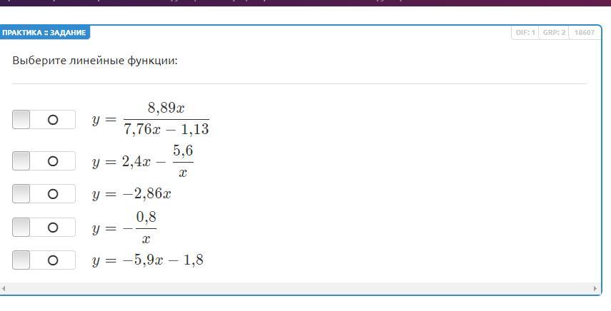 Линейная функция - это когда "икс чистый" (он не под корнем, не в степени и не в знаменателе дроби).