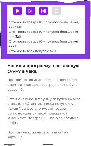 cost = int(input("Стоимость товара (0 - покупок больше нет): ")) // Вводим стоимость с клавиатуры