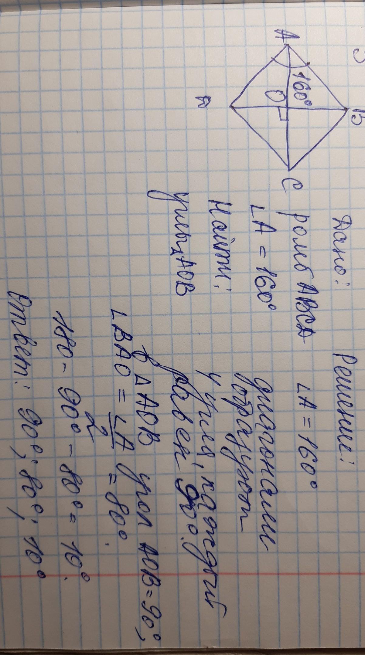 Диагонали ромба разбивают его на четыре треугольника. Найдите углы этих треугольников, если один из углов ромба 160°.с рисунком пожалуйста помогите