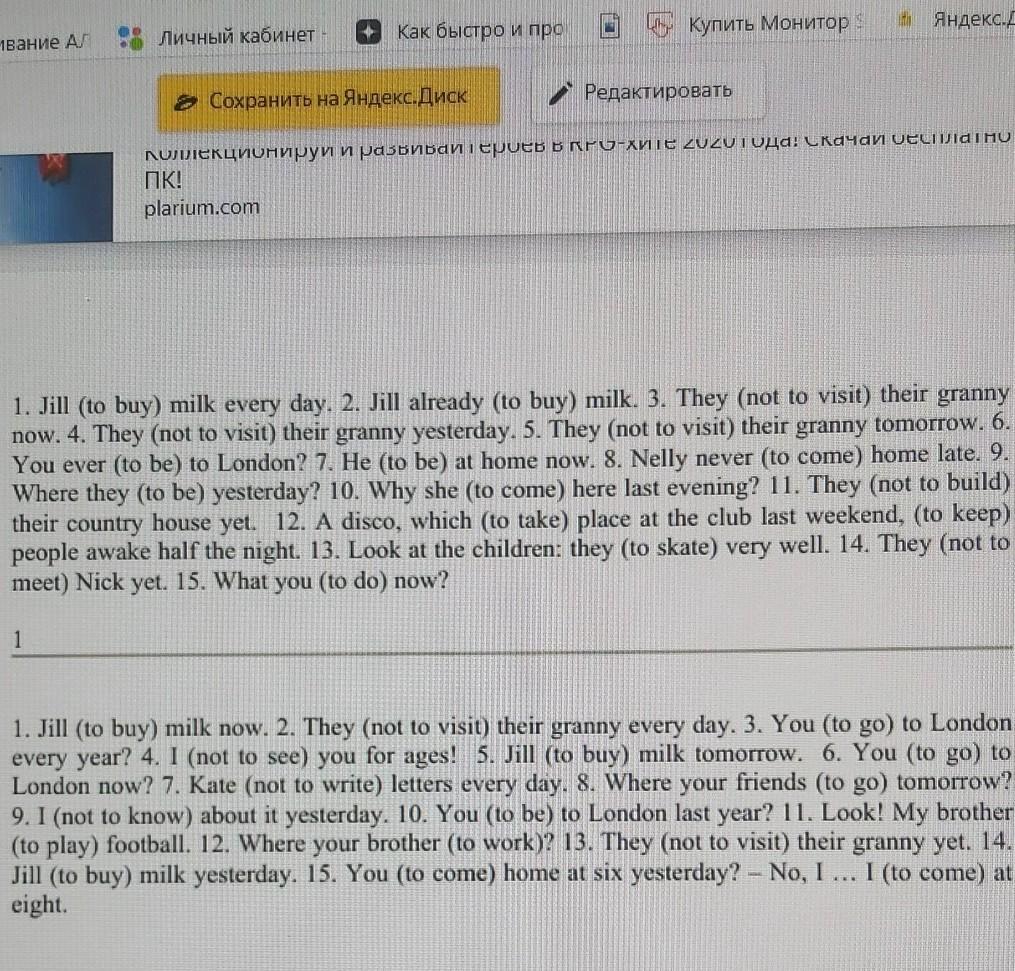 1. Джилл (покупать) молоко каждый день, 2. Джилл уже (покупать) молоко. 3. они (не навещают) свою бабушку Роу, 4. они (не навещают) свою бабушку вчера, 5. они (не навещают) свою бабушку завтра. 6. вы когда-нибудь (бывали) в Лондоне? 7. он (быть) сейчас дома, 8. Нелли никогда (не приходить) домой поздно. где они (быть) вчера? 10. зачем она (пришла) сюда вчера вечером? 11. они (еще не построили) свой загородный дом. 12. дискотека, которая (состоится) в клубе в прошлые выходные, (чтобы не дать) людям спать полночи. 13. посмотрите на детей: они (кататься на коньках) очень хорошо. 14, они (не встречаться) ник еще. 1. 5. что вам (делать) теперь? 1. Джилл (купить) молоко прямо сейчас. 2. они (чтобы не навещать) свою бабушку каждый день. 3. вы (едете) в Лондон каждый год? 4. я (чтобы не видеть) тебя целую вечность! 5. Джилл (чтобы купить) молоко завтра. 6. вы (ехать) в Лондон сейчас? 7. Кате (не писать) письма каждый день, 8. куда твои друзья (пойти) завтра? 9. (не знать) об этом вчера. 10. вы (будете) в Лондоне в прошлом году? 11. смотрите! мой брат (чтобы играть) в футбол. 12. где ваш брат (работать)? 13. они (еще не навестили) свою бабушку, 14, Джилл (чтобы купить) молоко вчера, 15. вы (чтобы прийти) домой вчера в шесть часов? - нет, я ... я (приду) в восемь.