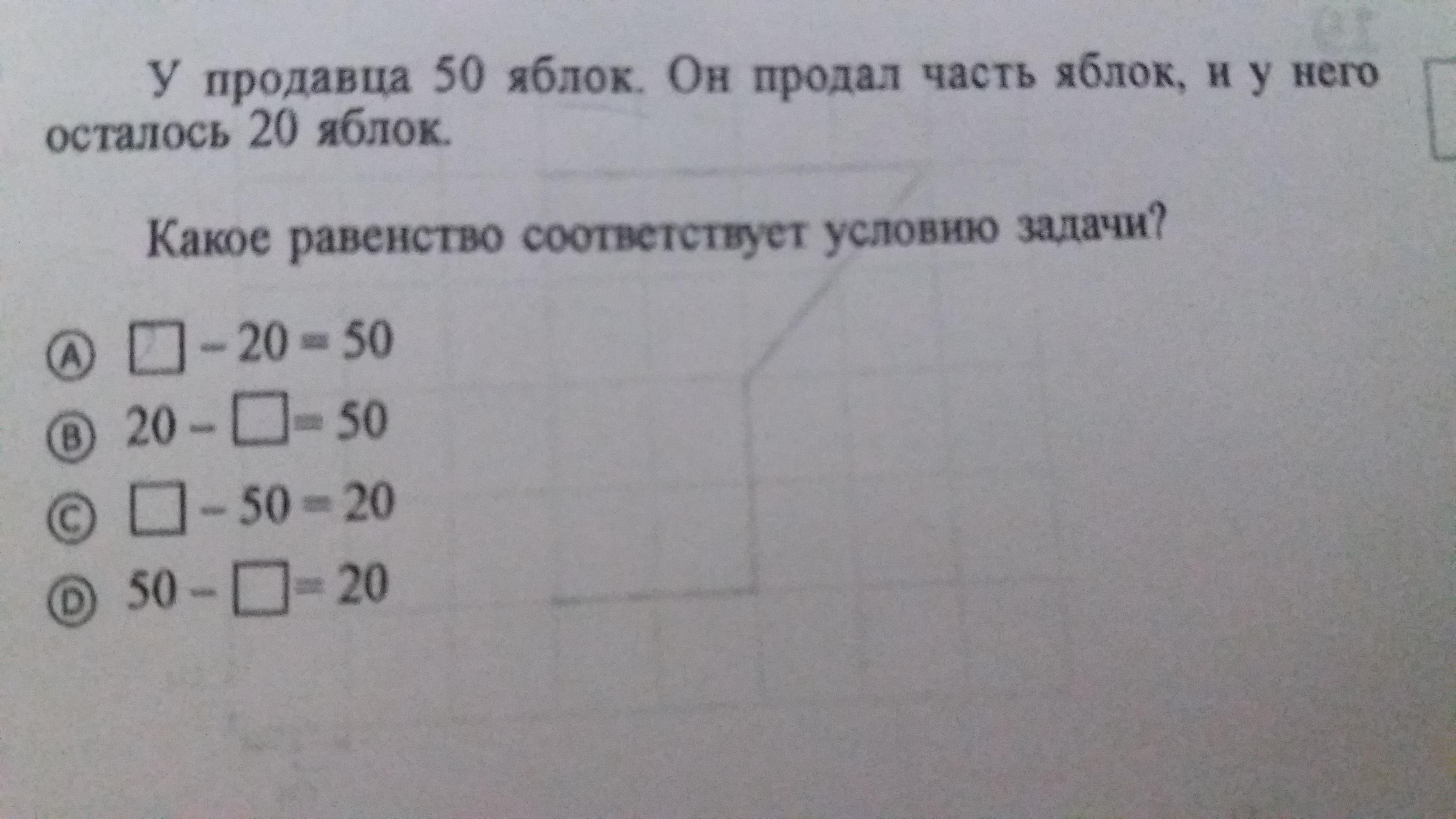 Поскольку было 50 яблок, а осталось двадцать, то от 50 отнимаем неведомою часть и получаем 20