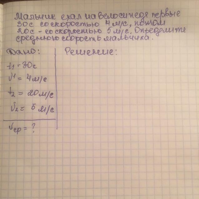 Мальчик ехал на велосипеде первые 30с со скоростью 4м/с, потом 20с - со скоростью 5м/с. Определите среднюю скорость мальчика.