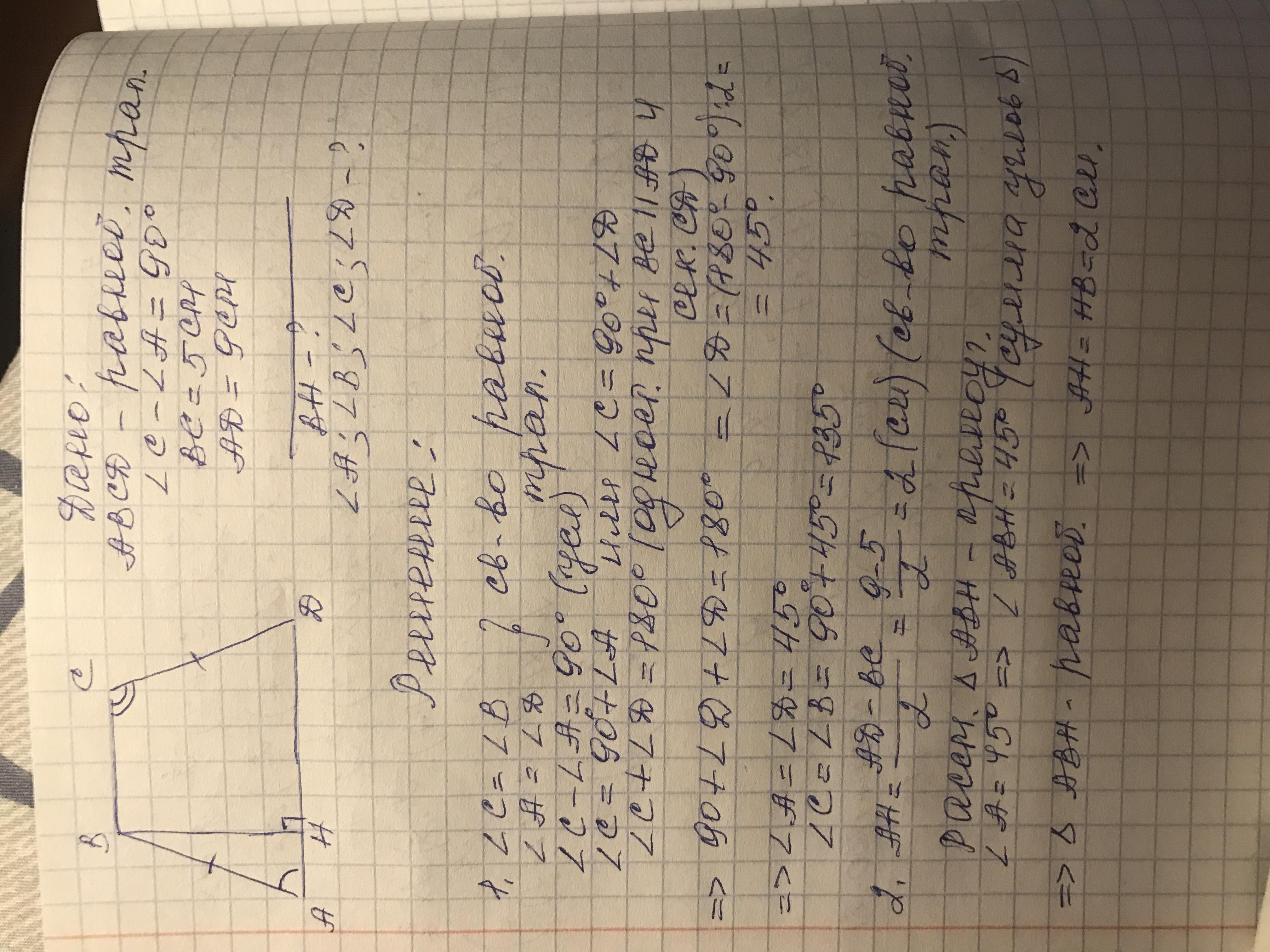Разность противолежащих углов равнобедренной трапеции равна 90 градусов. Найти углы трапеции и ее высоту, если основания трапеции равны 9см и 5 см.