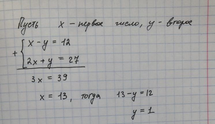 Разность двух чисел равна 12,а сумма удвоенного первого числа и