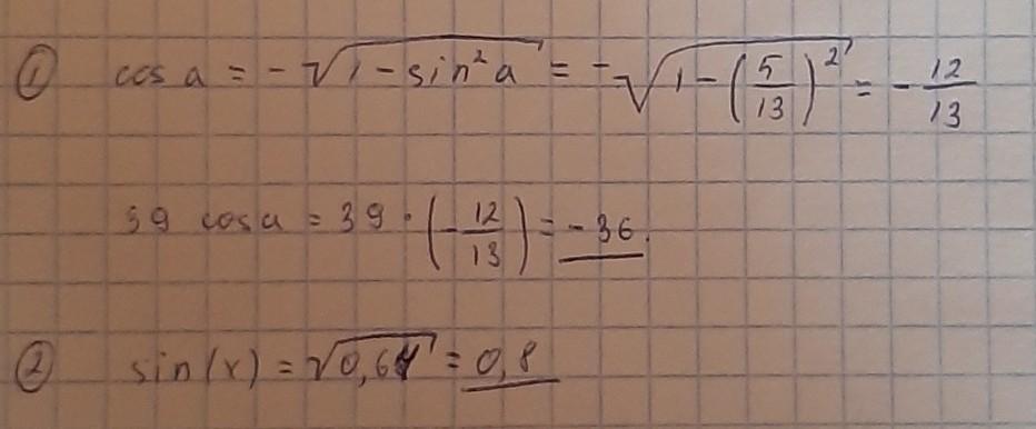1) Найти cos α, если sin α = 5/13 и π/2 < α < π.
