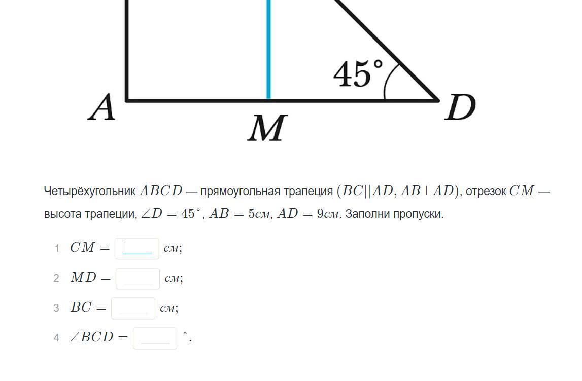МD=CM=5см. так как в прямоугольном треугольнике ∆MDC, <МDC=45°; <MCD=45°, то ∆ MDC- равнобедренный. МD=CM.