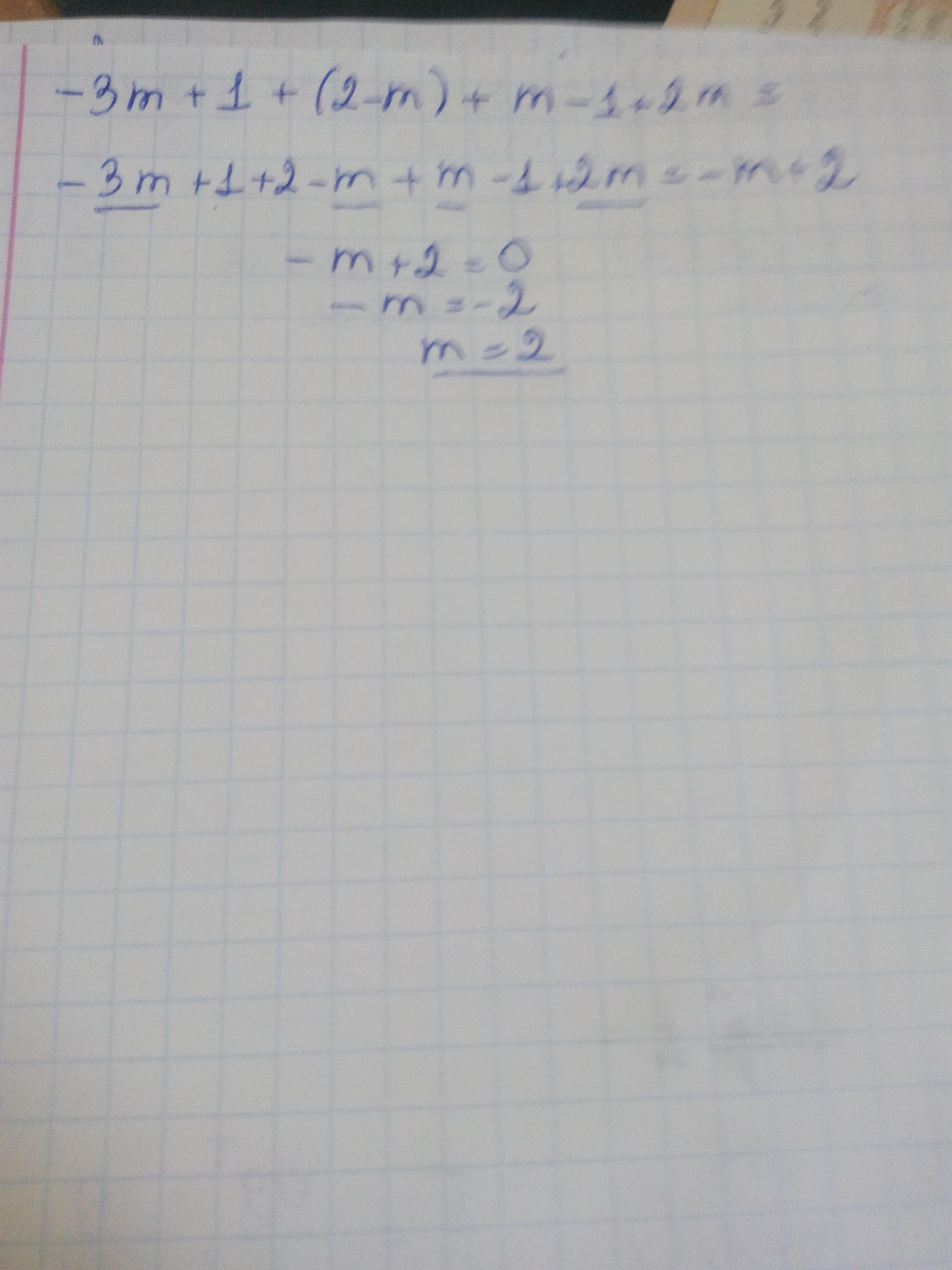 Упростите выражение−3m−(−1−(2−m))+(m−(1−2m))и найдите, при каком значении m значение этого выражения равно 0.