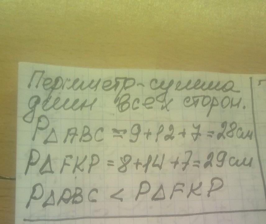 Равны ли ПЕРИМЕТРЫ треугольника АВС, стороны которого равны 9 см, 12 см и 7 см, и треугольника FKP, стороны которого равны 8 см, 14 см и 7 см?