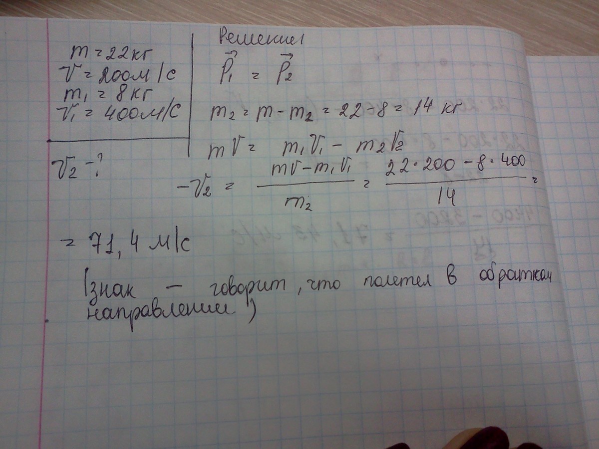 снаряд массой 22 кг,летевший горизонтально,имел скорость 200м/с.Снаряд разорвался на две части:меньшая массой 8кг,стала двигаться со скоростью 400м/с в прежнем направлении.Найти скорость большей части снаряда