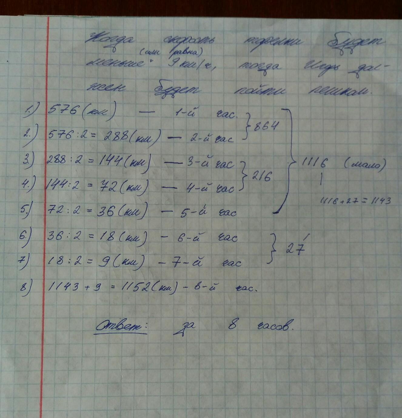 Игорь ходит со скоростью 9 километров в час. Между Санкт-Петербургом и Пекином 1152 километров. Игорь хочет добраться до Пекина на летающей тарелке. Первый час летающая тарелка летит со скоростью 576 километров в час, но затем каждый час скорость тарелки резко падает вдвое. В некоторый момент Игорь может выйти из летающей тарелки и дойти до Пекина пешком. За какое минимальное количество часов Игорь может добраться до Пекина?