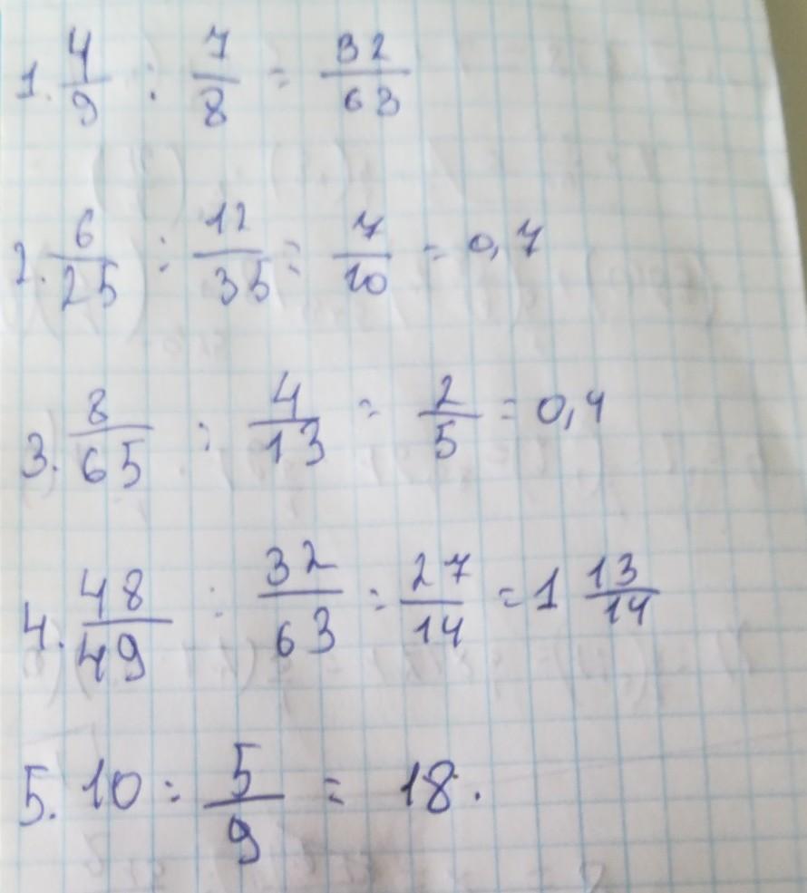 4/9 ∶ 7/8 , 2) 6/25 ∶ 12/(35 ) , 3) 8/65 ∶ 4/13 , 4) 48/49 ∶ 32/63 , 5) 10∶ 5/9 ,