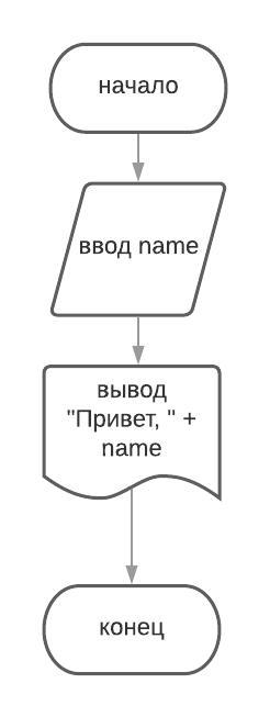 Составить блок-схему для ввода с клавиатуры своего имени (программа должна попросить это у пользователя) и последующего вывода на экран «Привет, [имя]» (Имя соответственно должно быть ваше).