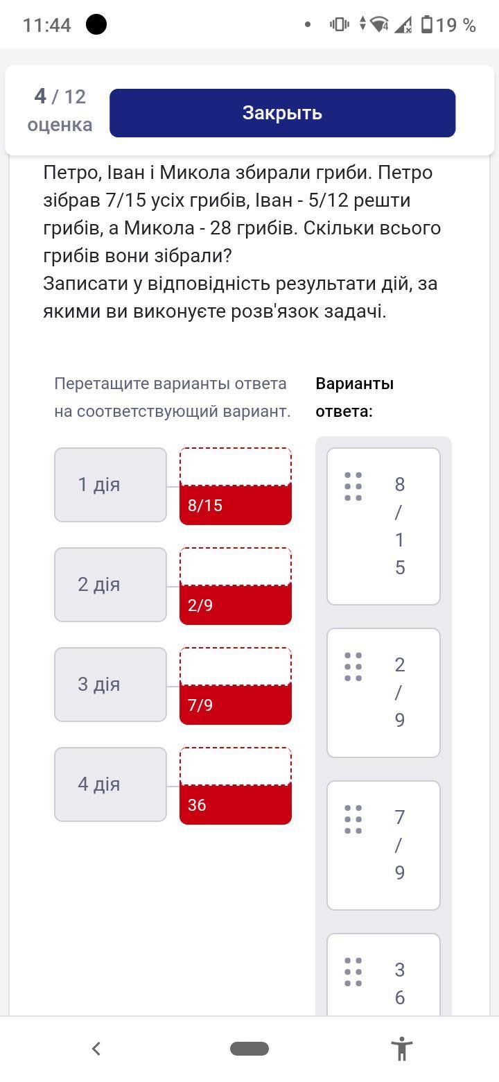 Петро, Іван і Микола збирали гриби. Петро зібрав 7/15 усіх грибів, Іван - 5/12 решти грибів, а Микола - 28 грибів. Скільки всього грибів вони зібрали?