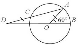 В окружности с центром в точке О проведены радиусы ОВ и ОА так, что ﮮАОВ=60°, ОВ = DС. Найдите величину ﮮАDО.
