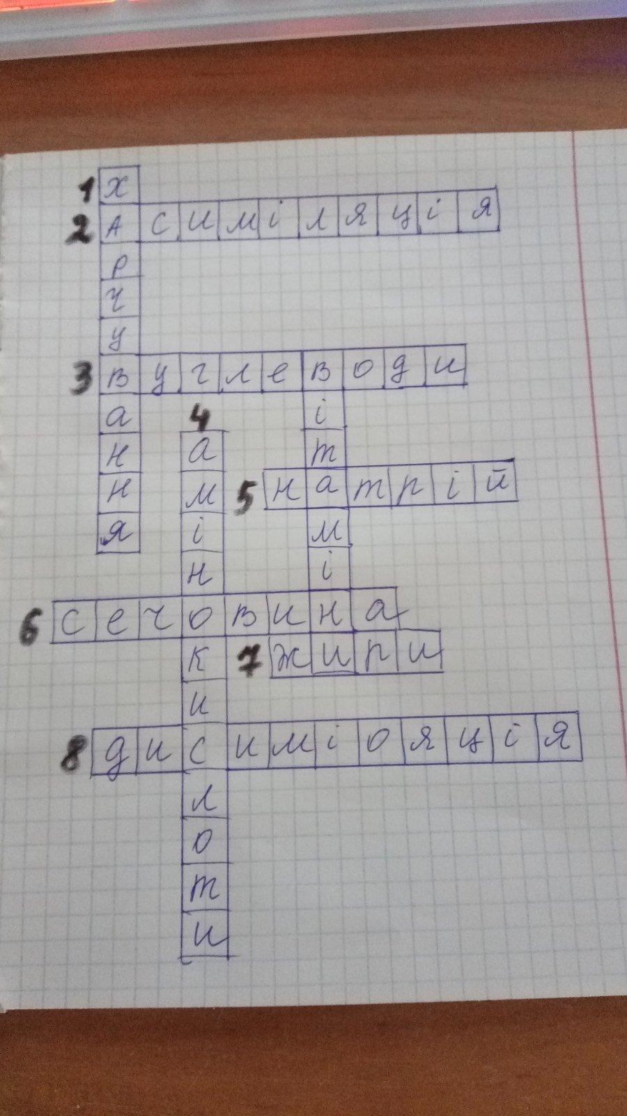 Відповідь 1 .Що для людини і для тварин є звичайним видом повсякденній діяльності. 2.Сукупність процесів біосинтезу органічних речовин з витратою енергії в живому організмі. 3. Разом із жирами та білками, належать до найважливіших та незамінних компонентів їжі. 4.Органічні сполуки, в молекулі яких одночасно містяться карбоксильні і амінні групи. 5. Хімічний елемент першої групи, третього періоду періодичної системи Менделєєва, з атомним номером 11. 6. Застосовується для очищення промислових вихлопів підприємств, теплових електростанцій, котелень та сміттєспалювальних заводів. 7. Один из важнейших компонентов пищи наряду с белками и углеводами. 8. Сукупність біохімічних процесів, за допомогою яких складні хімічні сполуки в організмі розкладаються до простіших, в результаті чого відбувається оновлення живої матерії та утворення потрібної для життєдіяльності енергії.