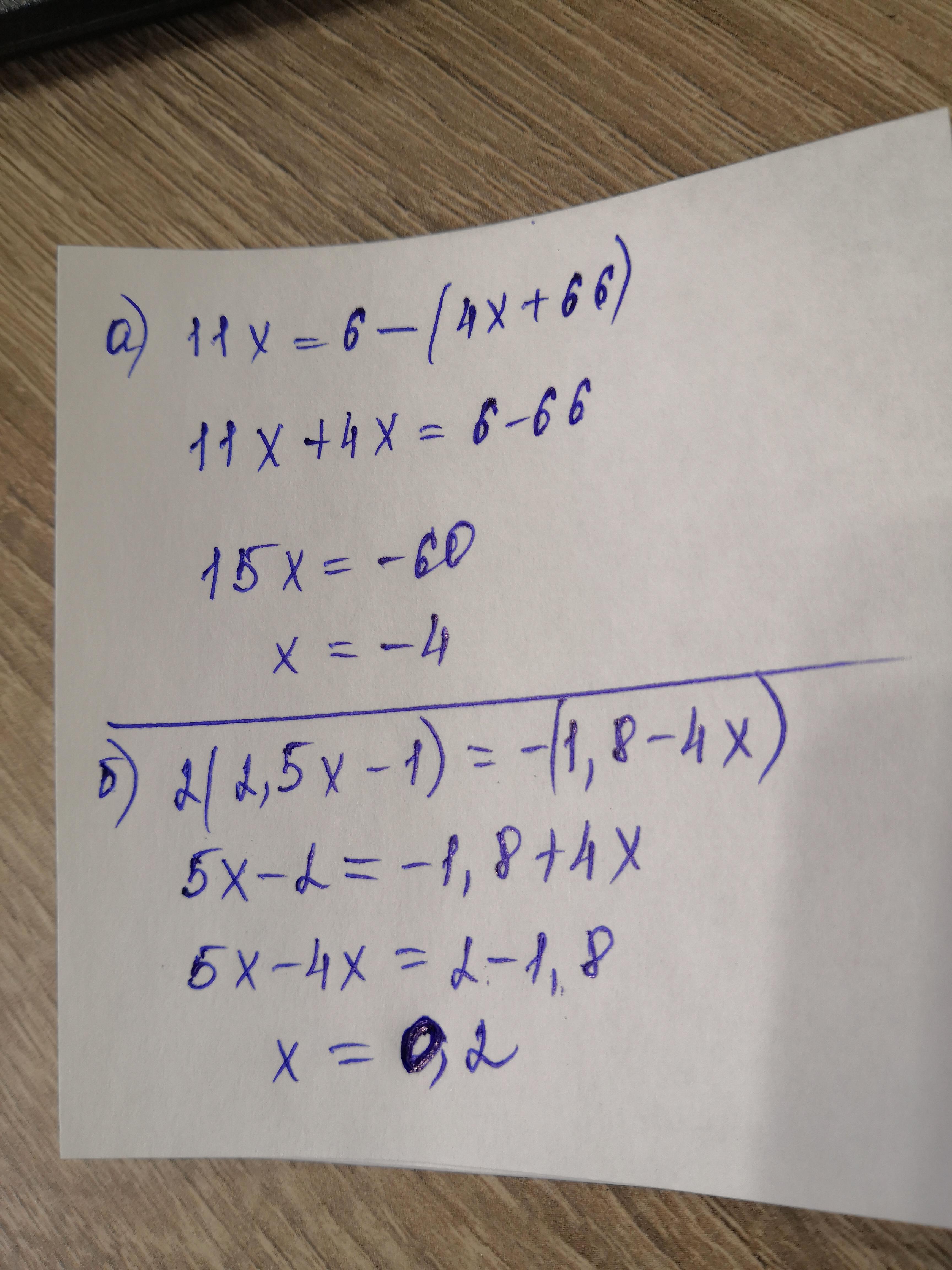 б)2(2,5x − 1) = −(1,8 − 4x)