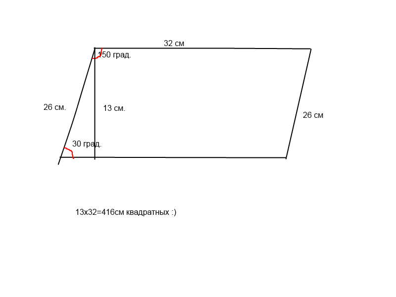 Так как сумма односторонних углов равна 180 град следовательно угол(на рисунке) равен 30 градусам. Проведем высоту как показано на рисунке. Так как катет лежащий против угла в 30 град равен половине гипотенузы. катет будет равен 13 см. Площадь будет равна 32 см х на 13 см = 416 см квадратных