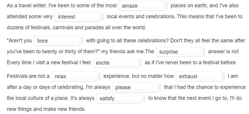 Amazing, interesting, bored, surprising, exited, relaxing, exhaused