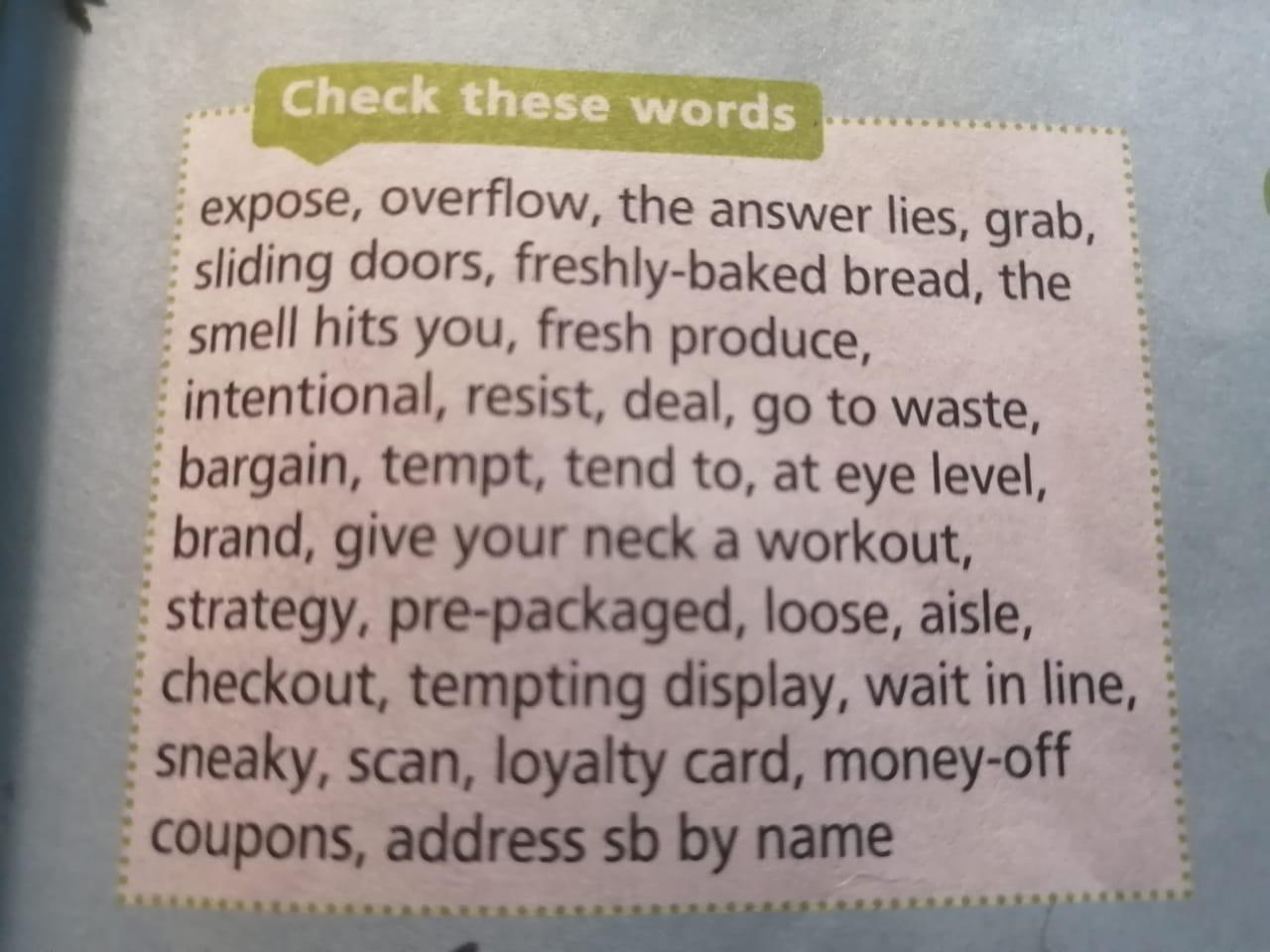 разоблачить, переполнить, ответ лежит, хватать, раздвижные двери, свежеиспеченный хлеб, запах поражает вас, свежие продукты, намеренно, сопротивляться, торговать, тратить впустую, торговаться, соблазнять, склонны, на уровне глаз, клеймить, давать ваша шея тренировка, стратегия, заранее упакованный, свободный, проход, касса, заманчивый дисплей, ожидание в очереди, подлый, сканирование, карта лояльности, купоны на скидку, адрес кого-то по имени