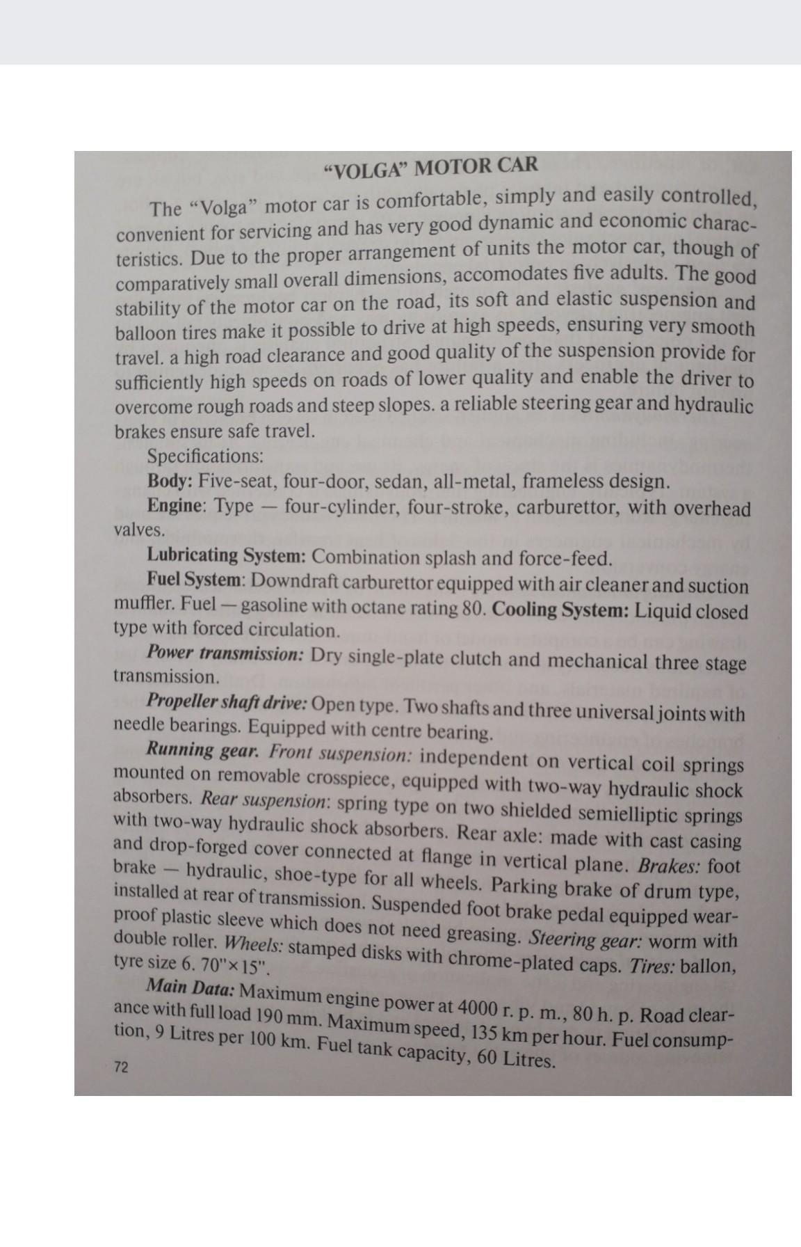 * O 4Gill 44% D17: 14 АВТОМОБИЛЬ «ВОЛГА» Автомобиль «Волга» комфортен, просто и легко управляется. удобен в обслуживании и имеет очень хорошие динамические и экономические характеристики. Благодаря правильному расположению агрегатов, автомобиль при сравнительно небольших габаритах вмещает пять взрослых человек. Хорошая устойчивость автомобиля на дороге, его мягкая и эластичная подвеска и баллонные шины позволяют ездить на высоких скоростях, обеспечивая очень плавный ход, большой дорожный просвет и хорошее качество подвески обеспечивают достаточно высокие скорости на дорогах. более низкого качества и позволяют водителю преодолевать неровные дороги и крутые склоны, надежный рулевой привод и гидравлические тормоза обеспечивают безопасное движение. Технические характеристики: Кузов: пятиместный, четырехдверный, седан, цельнометаллический, безрамной конструкции. Двигатель: Тип - четырехцилиндровый, четырехтактный, карбюраторный, с верхними клапанами. Система смазки: комбинация разбрызгивания и принудительной подачи. Топливная система: карбюратор с нисходящим потоком, оснащенный воздухоочистителем и глушителем на всасывании. Топливо - бензин с октановым числом 80. Система охлаждения: жидкостная закрытого типа с принудительной циркуляцией. Трансмиссия: Сухое однодисковое сцепление и механическая трехступенчатая трансмиссия. Привод гребного вала: Открытый тип. Два вала и три кардана с игольчатыми подшипниками. Оснащен центральным подшипником. Ходовая часть. Передняя подвеска: независимая на вертикальных винтовых пружинах, установленная на съемной поперечине, оснащена двухсторонними гидроамортизаторами. Задняя подвеска: рессорная на двух экранированных полуэллиптических рессорах с двухсторонними гидроамортизаторами. Задний мост: выполнен с литым корпусом и штампованной крышкой, соединенной фланцем в вертикальной плоскости. Тормоза: ножной тормоз - гидравлический, колодочный на все колеса. Стояночный тормоз барабанного типа, установлен в задней части трансмиссии. Подвесная педаль ножного тормоза снабжена износостойкой пластмассовой втулкой, не нуждающейся в смазке. Рулевой механизм: червячный с двойным роликом. Колеса: диски штампованные с хромированными колпаками. Шины: ballofni, размер шин 6. 70 "x 15" Основные данные: Максимальная мощность двигателя при 4000 р. п. м., 80 ч. п. Ширина проезжей части при полной загрузке 190 мм. Максимальная скорость 135 км в час. Расход топлива 9 литров на 100 км. Емкость топливного бака 60 литров. 72 3АКПБИТБ