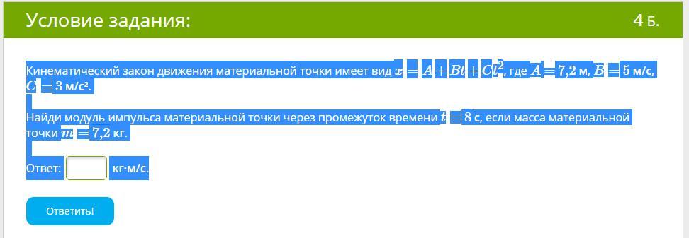 Найди модуль импульса материальной точки через промежуток времени t= 8 с, если масса материальной точки m= 7,2 кг.