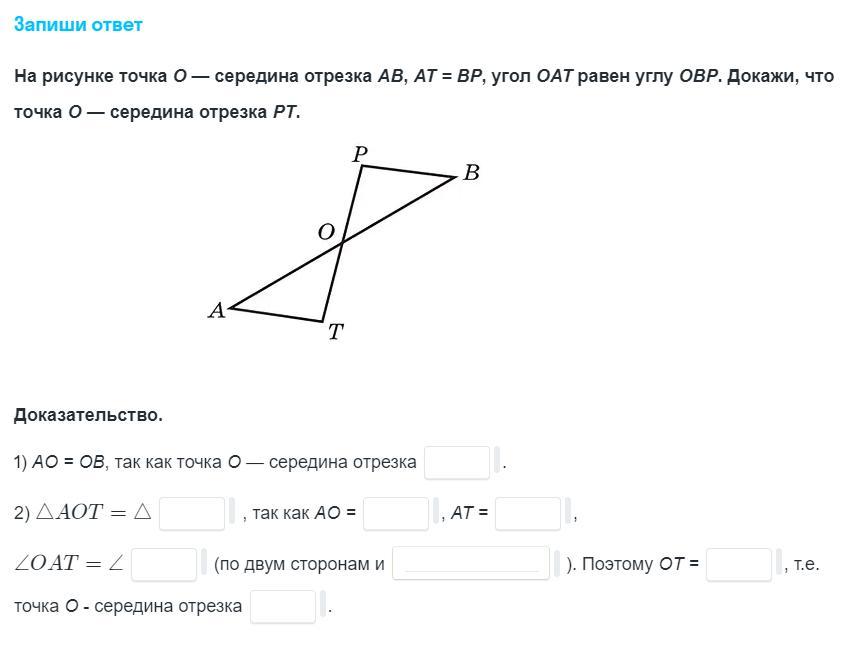 2. Тр-к АОТ = Тр-к(у) ВОР, так как АО = ОВ, АТ = ВР, угол ОАТ = угол(у) ОВР (по двум сторонам и углу (между ними)). Поэтому ОТ = ОР, т.е. точка О -- середина отрезка РТ.