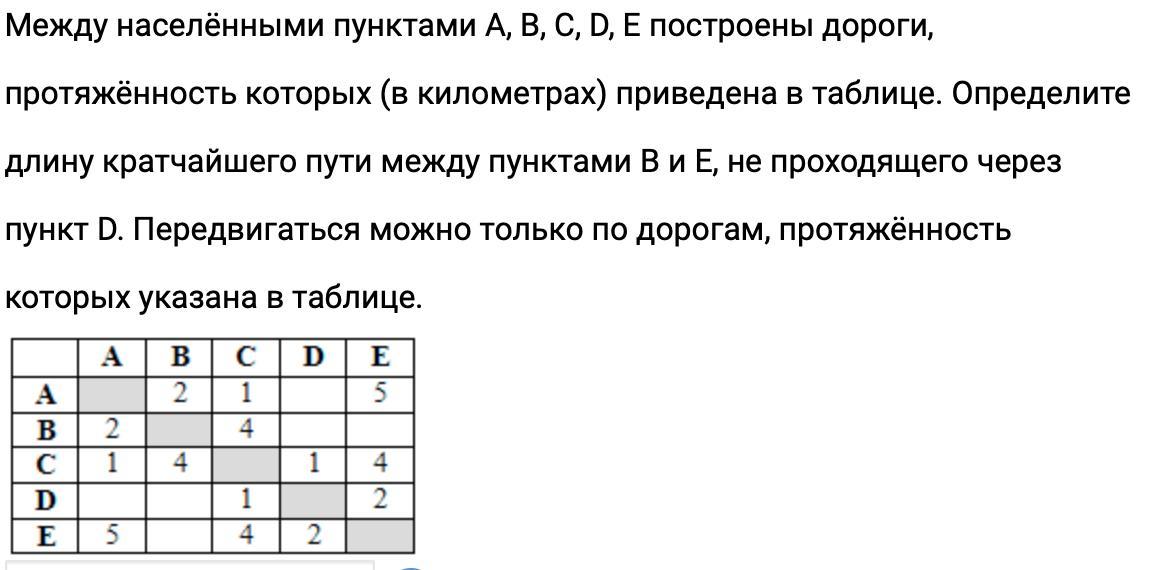 Самый кратчайший путь между пунктами B и E Ответ: 6.