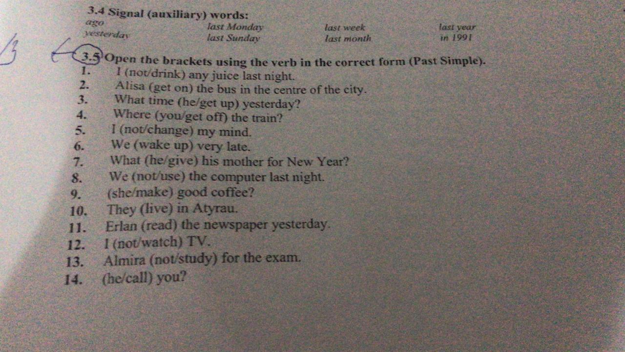 Ответ: 1.-I didn’t drink any juice last night. 2.-Alisa got on the bus in the centre of the city. 3.- What time did he get up yesterday? 4.-Where did you get off the train. 5.-I didn’t grande my mind. 6.-We woke up very late. 7.-What did he give his mother for New Year? 8.-We didn’t use the computer last night. 9.-Did she make a good coffee? 10.- They lived in Atyrau. 11.-Erlan read the newspaper yesterday. 12.- I didnt watch TV. 13.-Almirante didnt study for the exam. 14.-Did he call you?