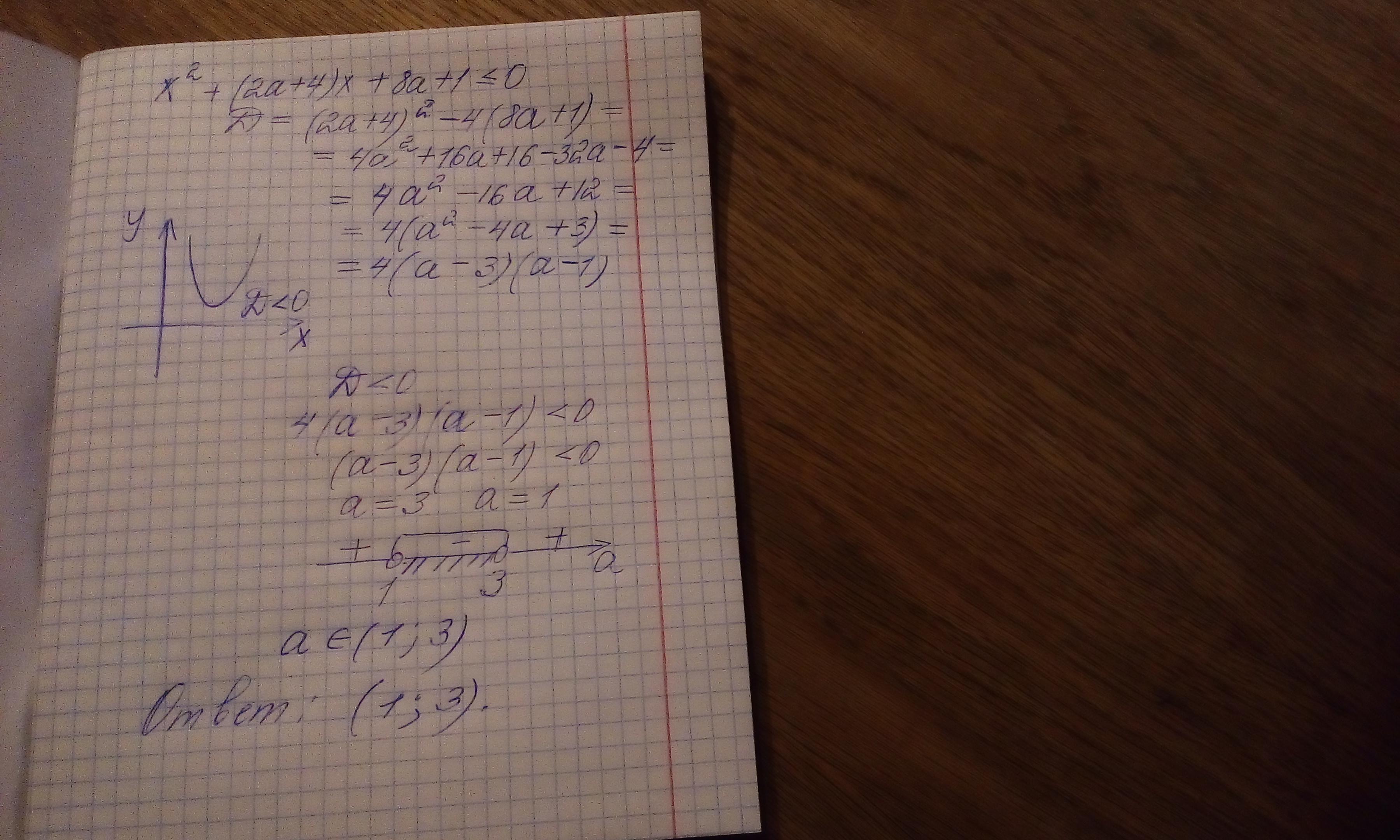 Найдите все значения а, при которых неравенства x2+(2a+4)x+8a+1<=0 не имеет решений помогите пожалуйста.