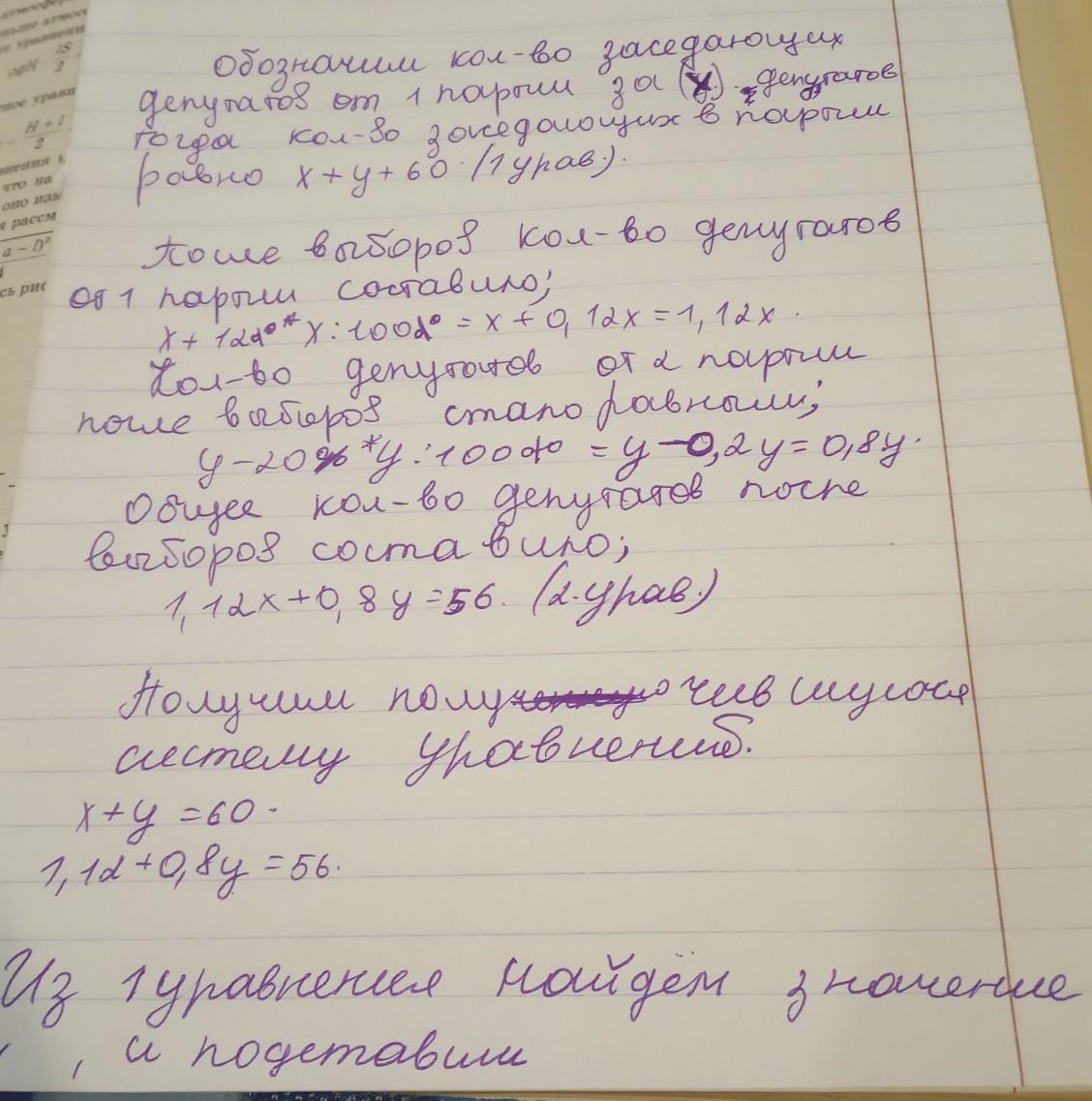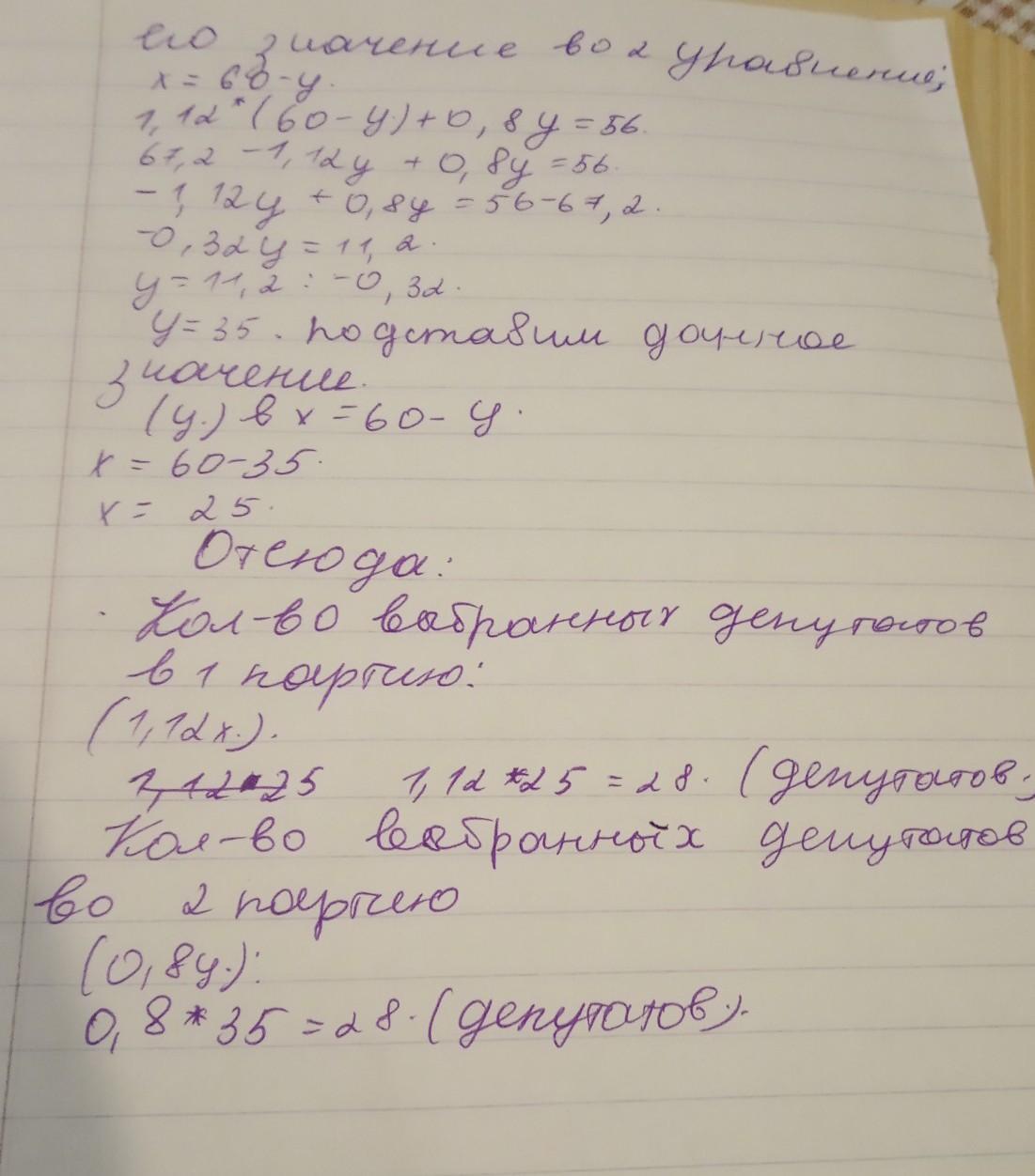 В городской думе заседало 60 депутатов, представляющих две партии. После выборов число депутатов от первой партии увеличилось на 12%, а от второй партии - уменьшилось на 20%. Сколько депутатов от каждой партии оказалось в думе после выборов, если всего было выбрано 56 депутатов?