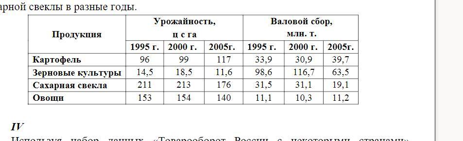 Используя набор данных «Валовой сбор и урожайность», построить столбчатую диаграмму, отражающую изменение урожайности картофеля, зерновых и сахарной свеклы в разные годы.