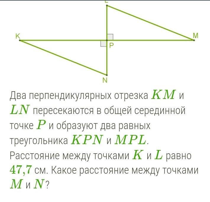Два перпендикулярных отрезка KM и LN пересекаются в общей серединной точке P и образуют два равных треугольника KPN и MPL Расстояние между точками K и L равно 46,2 см. Какое расстояние между точками M и N?