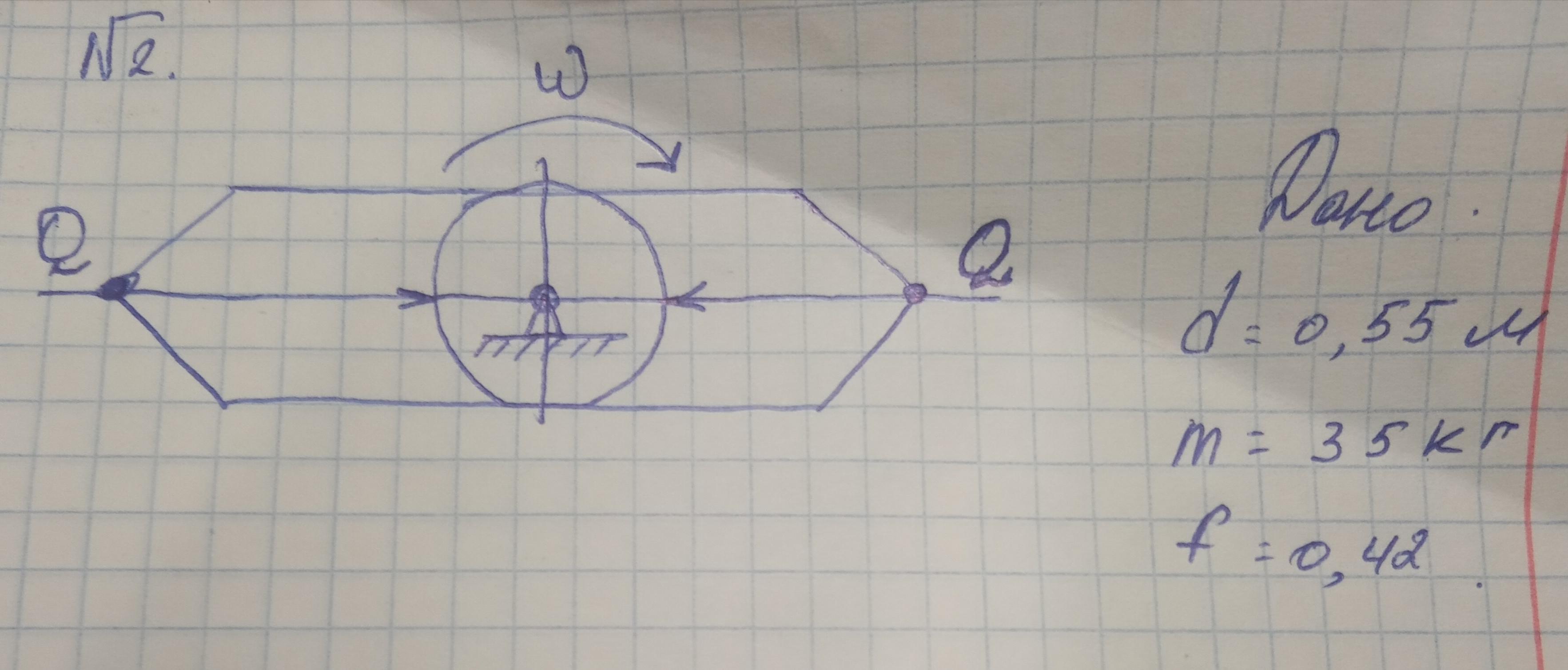 F=2000 H d=0.55 м m=35 кг f=0.42 no=7.5 об/с t=?