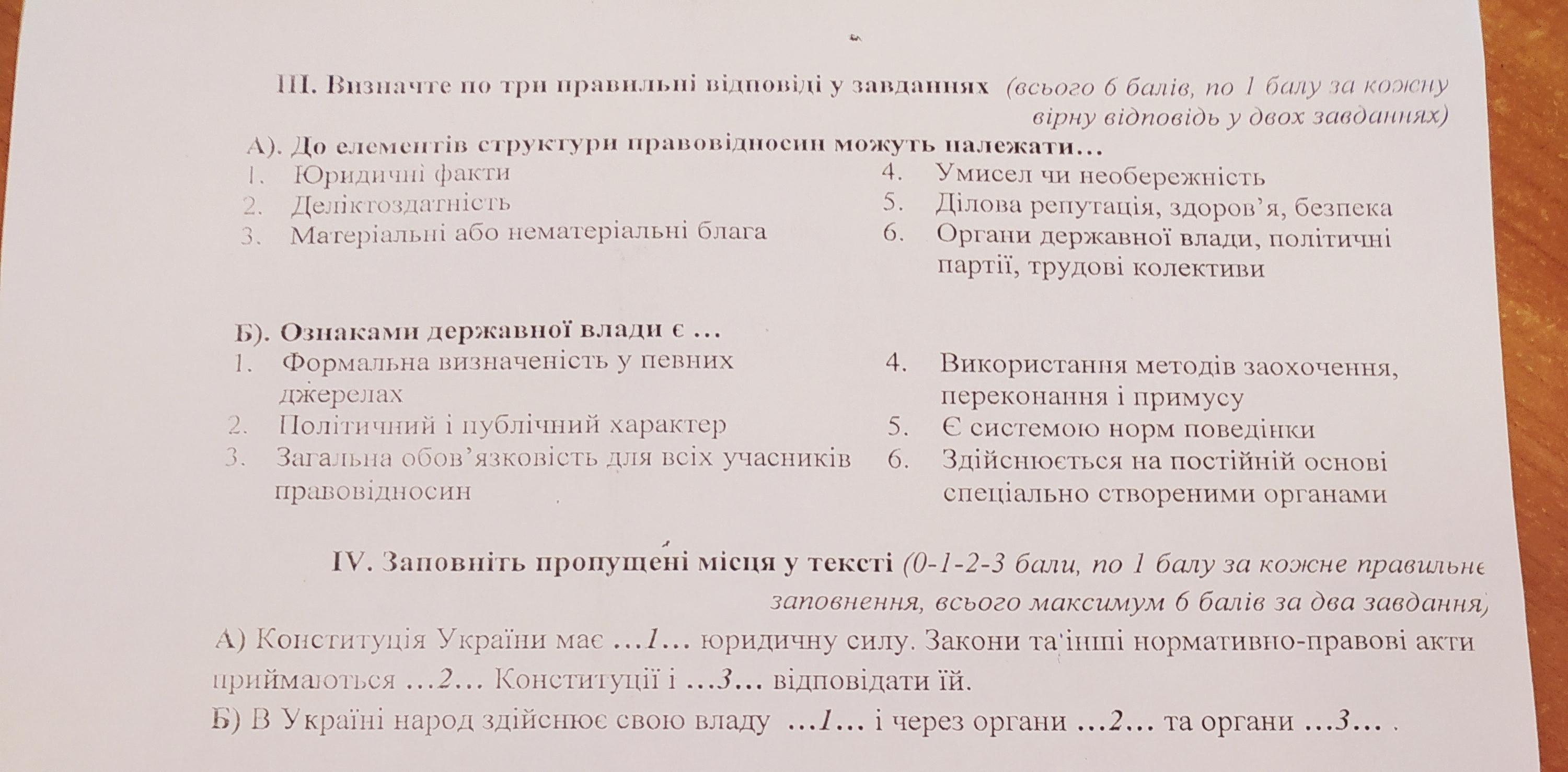 ІІІ. А)1,2,3 Б)2,4,6; ІV. А) 1-найвищу, 2-на основі, 3-повинні; Б) 1-безпосередньо; 2-державної влади; 3-місцевого самоврядування.