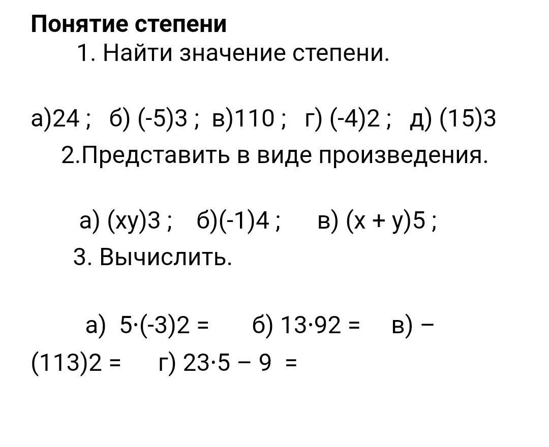 1. a). 2^4=16. б). (-5)^3=-125. в). 1^10=1 г). (-4)^2=16 д). 15^3=3375