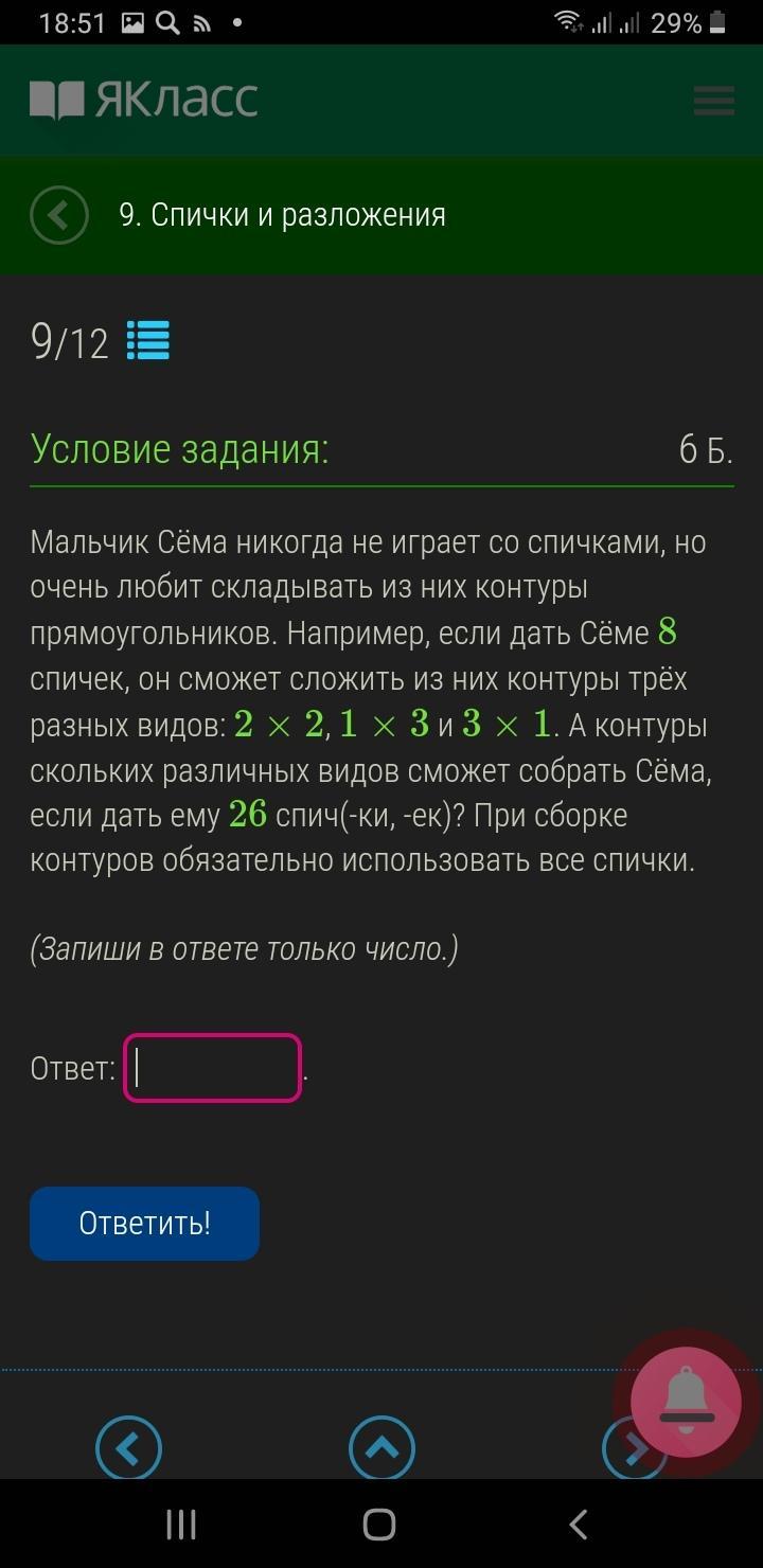 Мальчик Сёма никогда не играет со спичками, но очень любит складывать из них конторы прямоугольников. Например если дать Смерть 8 спичек, он сможет сложить контуры трёх разных видов: 2±2; 1 ±3; 3±1. А контуры скольки разных видов сможет собрать Сёма, если ему дать 26 спичек. При сборке контуров обязательно использовать все спички.