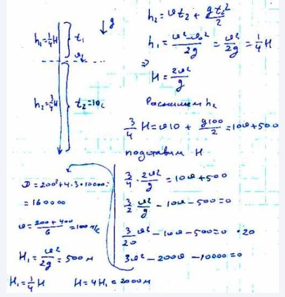 Свободно падающее тело в последние 10 с своего движения проходит 3/4 всего пути. Определите высоту, с которой падало тело без начальной скорости. g - 10 м/с.